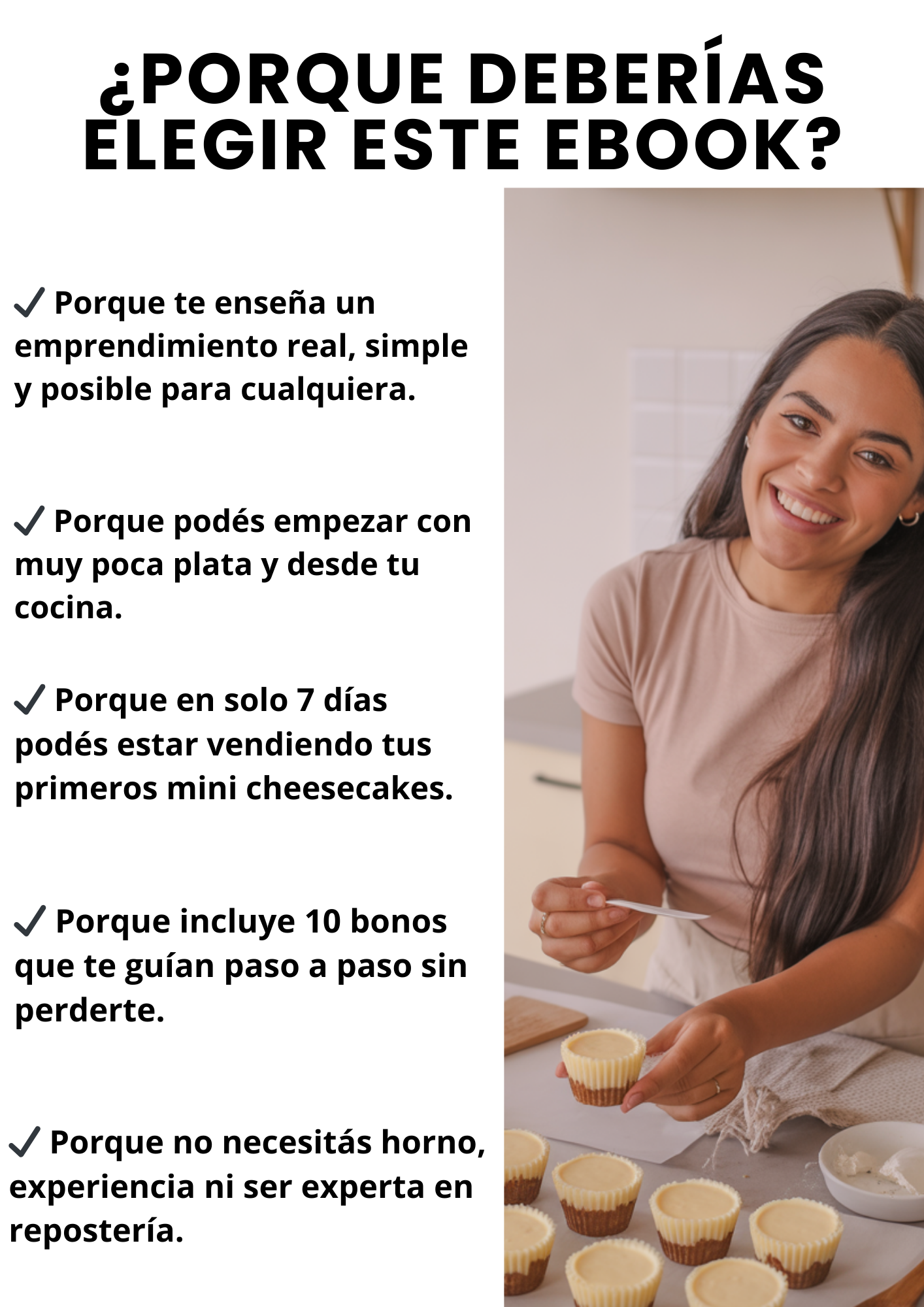 "Tenía miedo de no poder vender, pero las estrategias que enseña el ebook son oro puro. En una semana ya tenía pedidos para cumpleaños y eventos. Los mini cheesecakes se venden solos porque quedan espectaculares y son porciones perfectas."